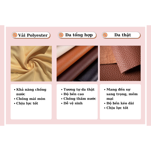 Da Tổng Hợp là lựa chọn thay thế giá rẻ cho da thật, với vẻ ngoài tương tự và khả năng chống nước tốt. Da tổng hợp dễ dàng vệ sinh và không yêu cầu bảo trì phức tạp như da thật. Dù vậy, độ bền của da tổng hợp thường không bằng da thật, dễ bị trầy xước và bong tróc sau một khoảng thời gian sử dụng, và có thể không mang lại cảm giác sang trọng và cao cấp như da thật.