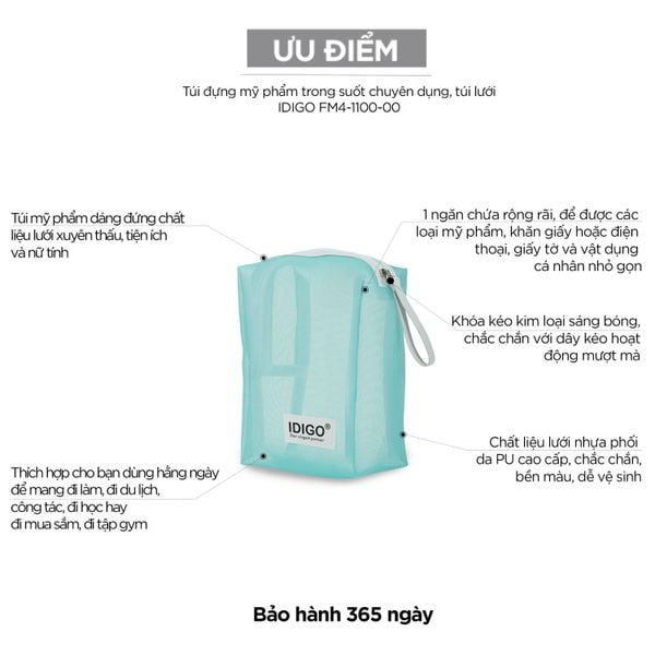 Với mong muốn mang lại cho khách hàng những mẫu túi đựng mỹ phẩm chất lượng, tiện dụng, IDIGO cho ra mắt sản phẩm Túi mỹ phẩm nữ phom đứng phối lưới IDIGO FM4-1100-00.