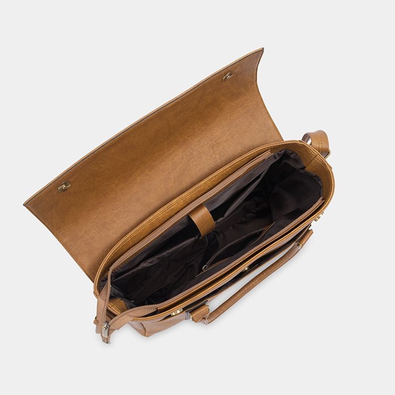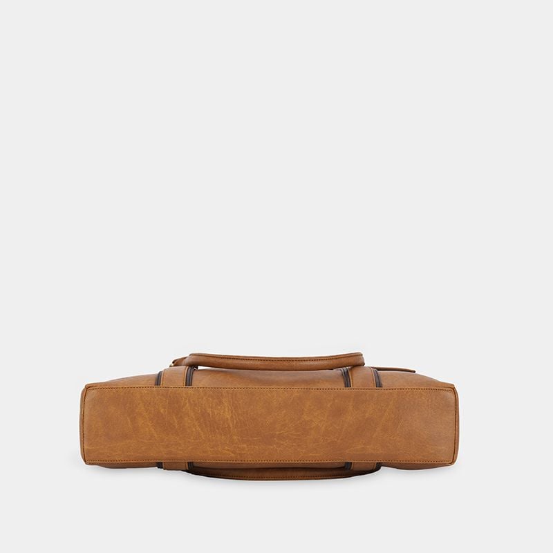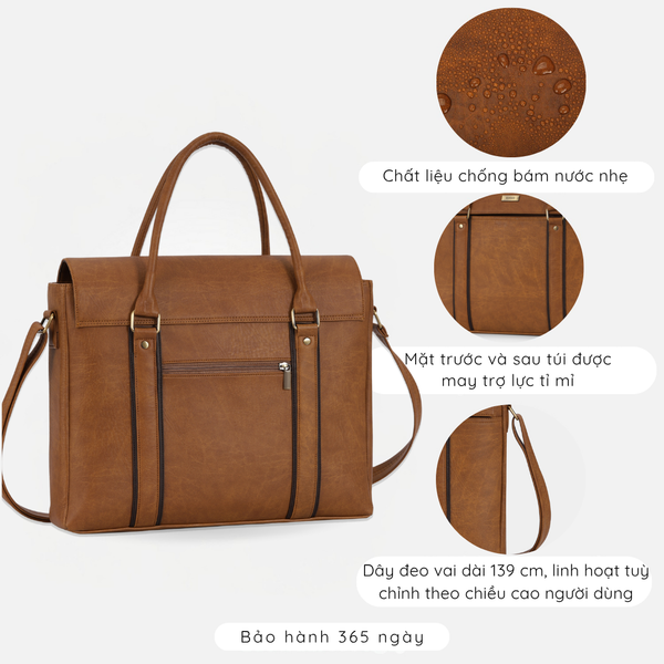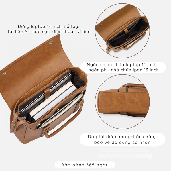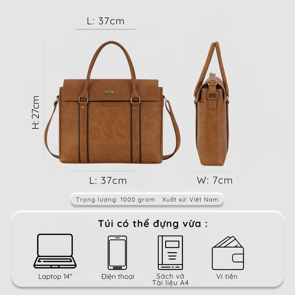 - Thiết kế tối giản, hiện đại với phom túi cứng cáp, không bị cong vênh nhăn gãy nhờ chất liệu da tổng hợp cao cấp. Túi chứa được tài liệu A4 và laptop 14 inch.