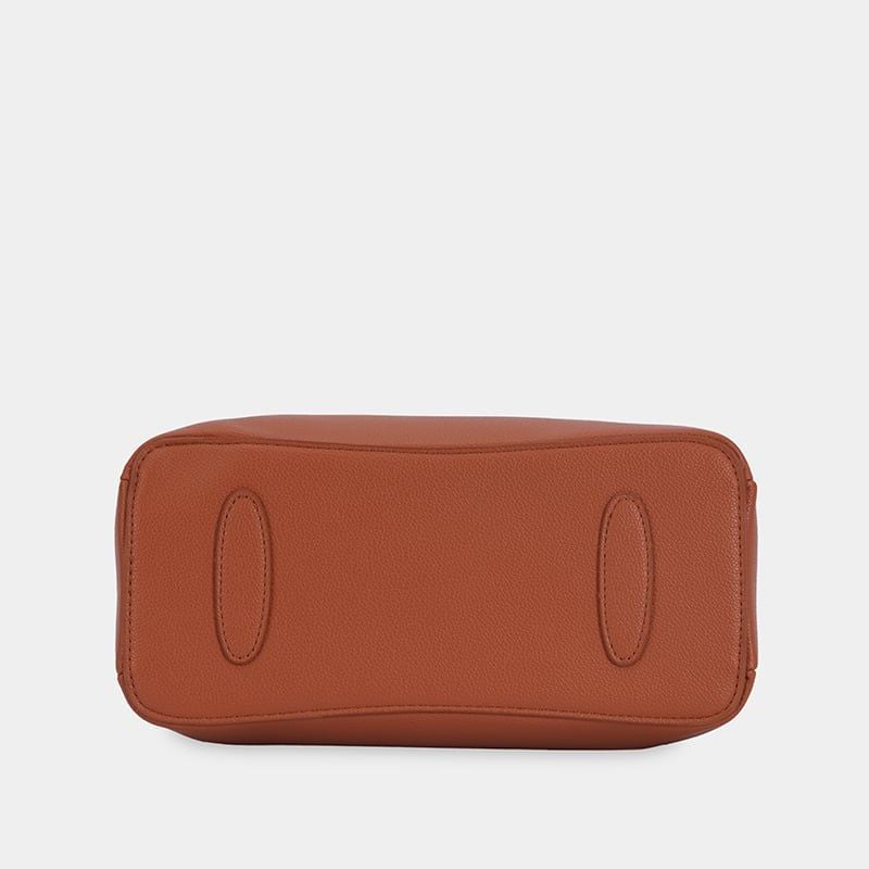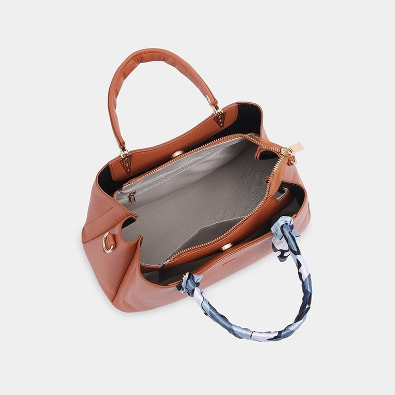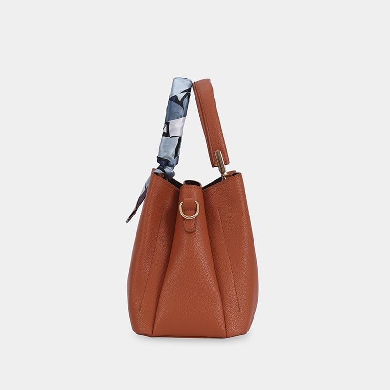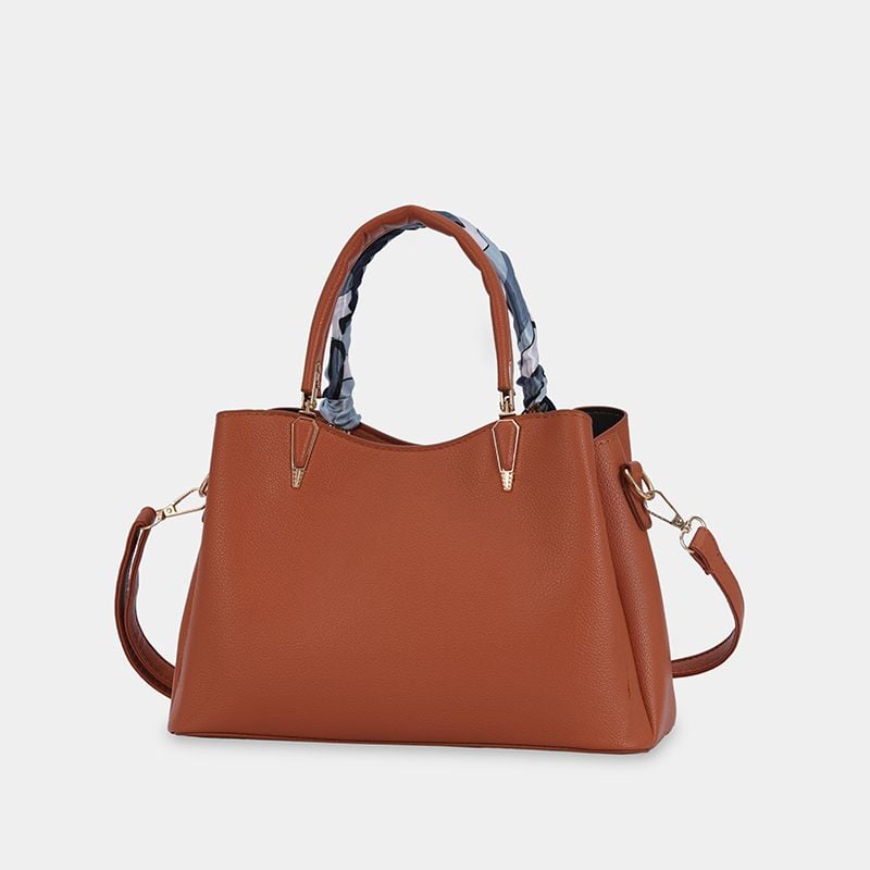 - Phom túi hình thang với chất liệu da PU có độ mềm vừa phải giúp túi hạn chế bị cong vênh, nhăn gãy khi sử dụng. Túi có kèm khăn lụa thắt quai thời trang, độc đáo.